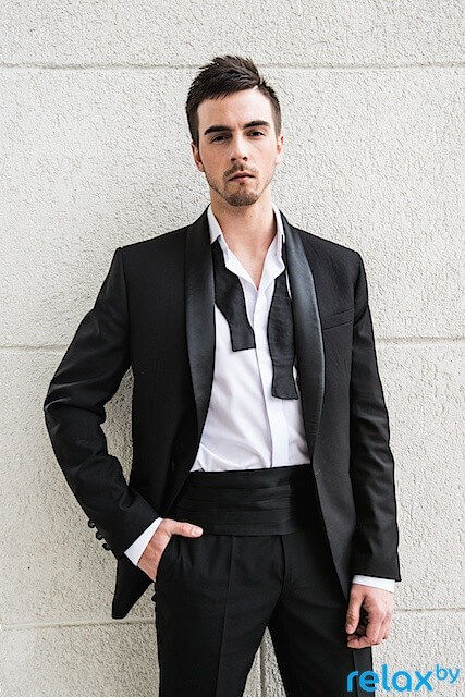 Костюм, рубашка, запонки, жилетка, платочек, пояс или ремень, бабочка или галстук. Без обуви.